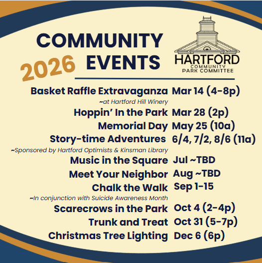 *The events of the Park Committee are planned and held by the members of the Park Committee but are governed under the auspices of Hartford Township. All funds received or paid out are processed by the Hartford Township Fiscal Officer through the Park Appropriation which is included in the Township Budget.